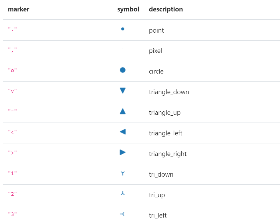 matplotlib.markers Functions to handle markers; used by the marker functionality of plot, scatter, and errorbar. All possible markers are defined here: marker symbol description "." point "," pixel "o" circle "v" triangle_down "^" triangle_up "<" triangle_