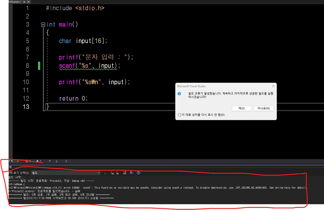 scanf 에러 발생(C4996) 오류 C4996 'scanf': This function or variable may be unsafe. Consider using scanf_s instead. To disable deprecation, use _CRT_SECURE_NO_WARNINGS. See online help for details. Project2 C:\Project2\Project2\FileName.c 8 에러