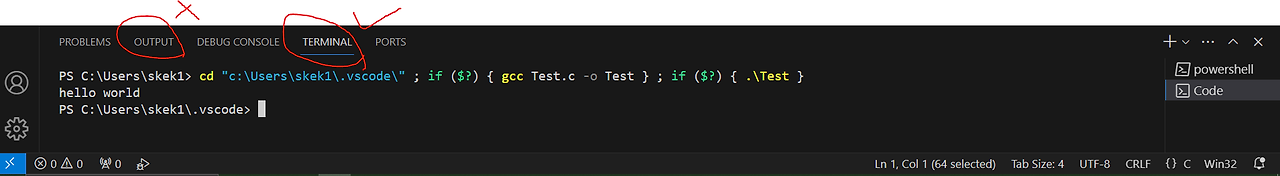 프로그램 다시 시작해 보면 OUTPUT 대신 TERMINAL에 실행 결과가 나타난다.