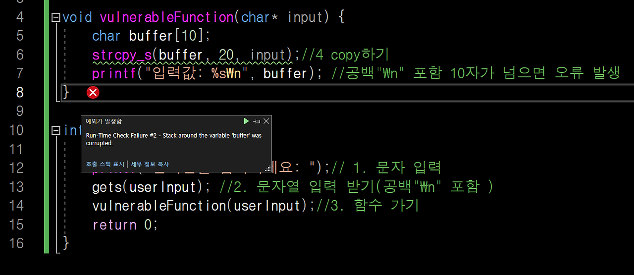 buffer 10 바이트 보다 큰 11바이트를 복사해서 넣을려고 하니 버퍼 오버플로우가 발생해 오류가 났다.