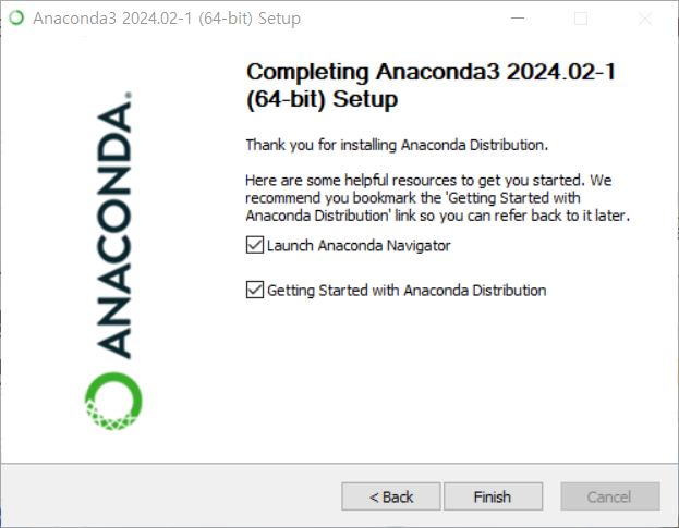 finish 누르면 자동으로 아나콘다가 실행된다.