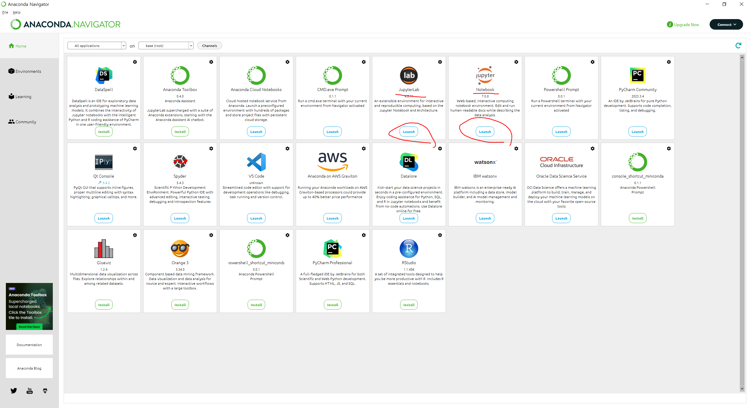 아나콘다 초기 화면을 보면 JupterLab 과 Jupyter Notebook을 볼 수 있다.