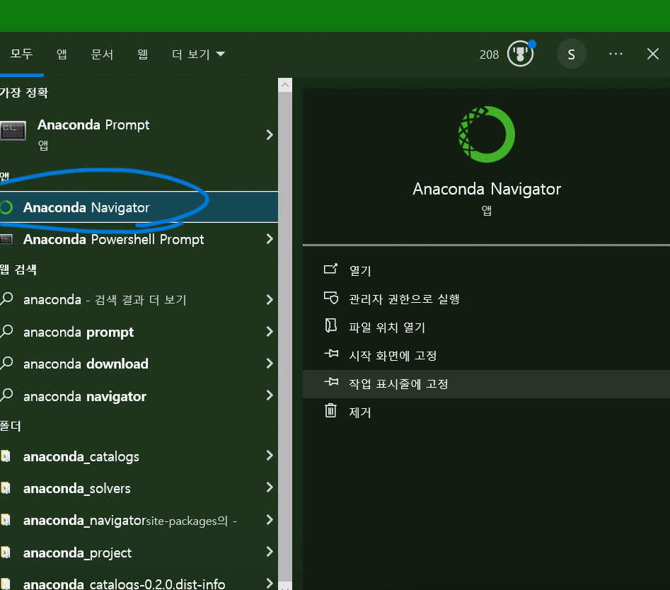 만약 아나콘다를 직접 실행 하고 싶으면 시작메뉴에서 anaconda navigator를 검색하면 된다.