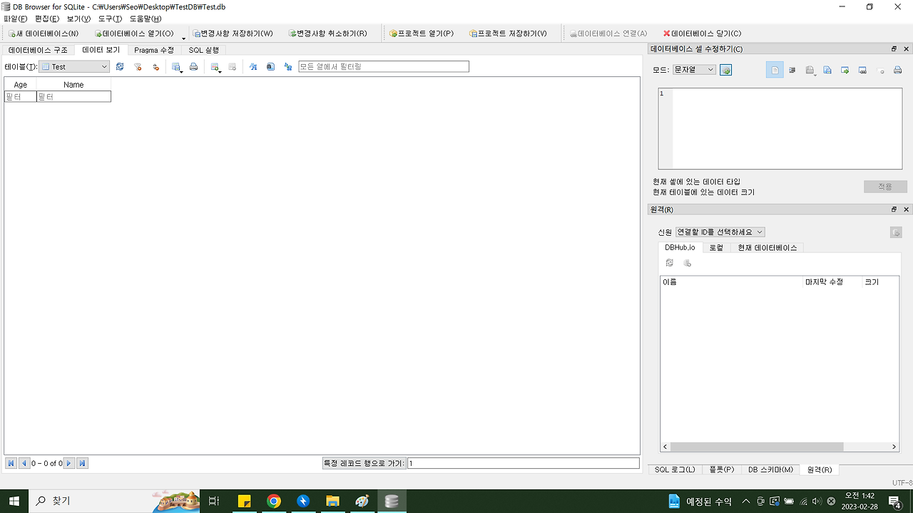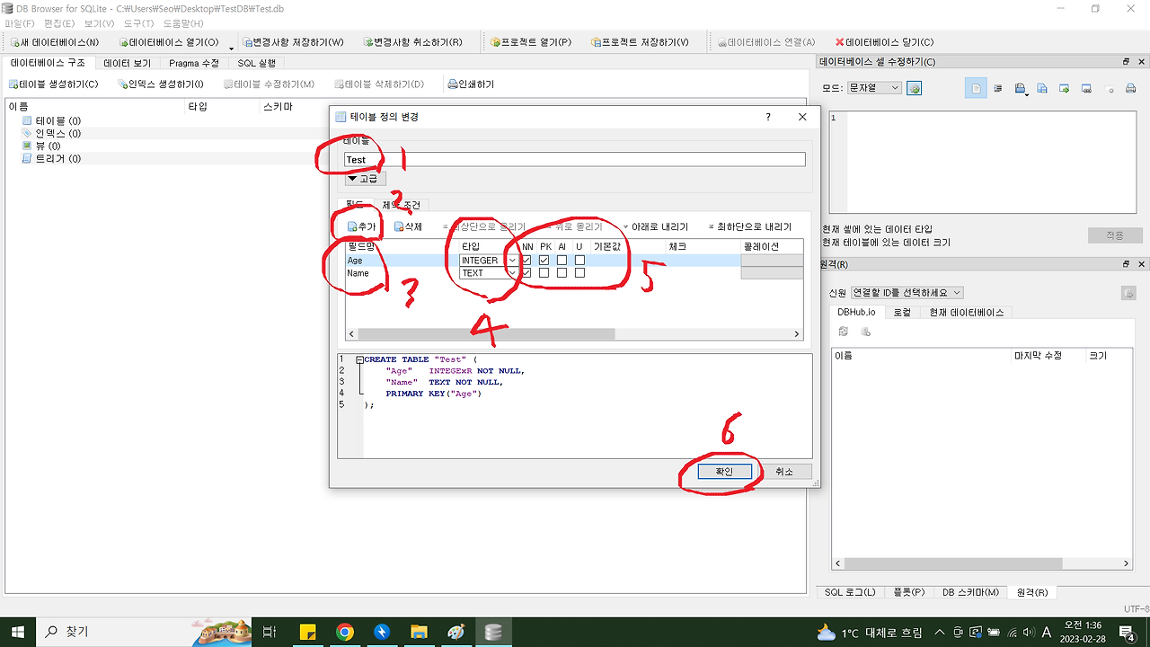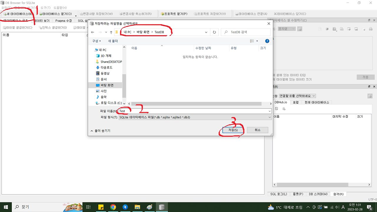1. 새 데이터베이스 -> 바탕화면\TestDB폴더\Test 로 저장