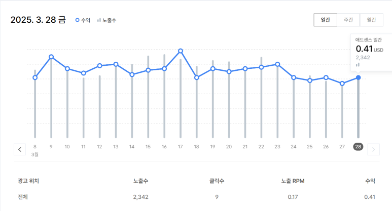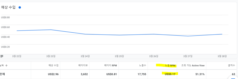 내 애드센스는 노출 RPM이 0.17 달러 밖에 안되기 때문에 저단가 광고라고 할 수 있다.