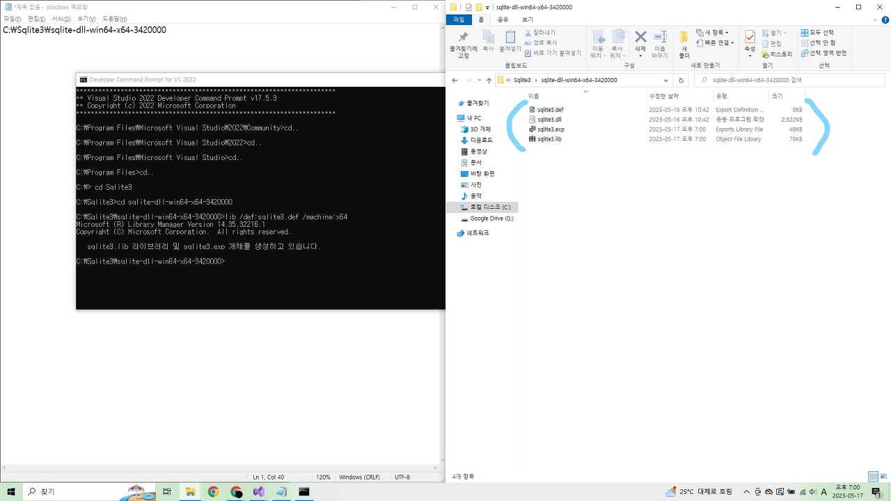 4. Prompt 화면이 뜰텐데 sqlite3.def, sqlite3.dll 이 있는 sqlite-dll-win64-x64-3420000 디렉토리로 이동한다.