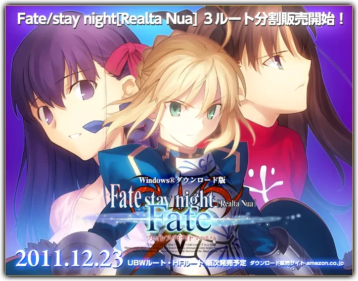 페이트 스테이 나이트(스튜디오 딘) -> 페이트 스테이 나이트 UBW 극장판(스튜디오 딘)-> 페이트 스테이 나이트 zero(유포테이블) -> 페이트 스테이 나이트 ubw(유포테이블) -> 페이트 스테이 나이트 헤븐즈 필(유포테이블) -> 외전