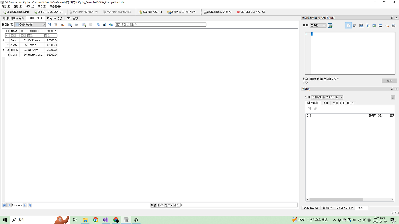 DB Browser를 실행 시켜 확인해보면 테이블이 만들어지고 데이터가 Insert 된 것을 확인 할 수 있다.