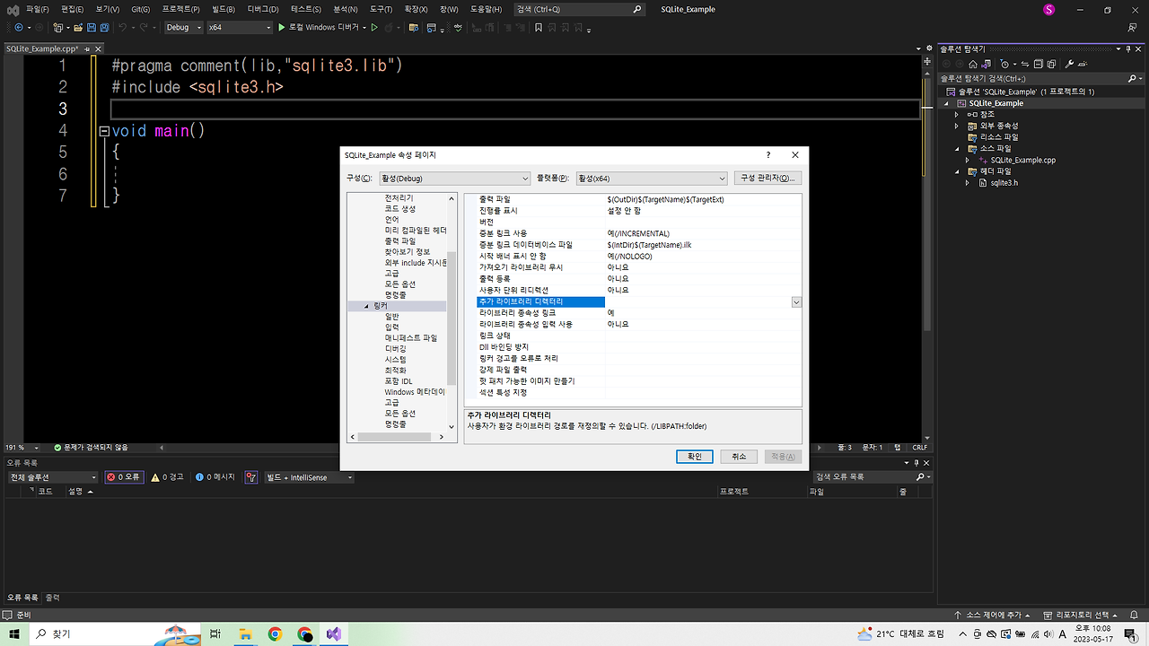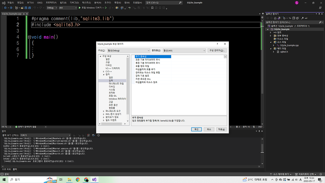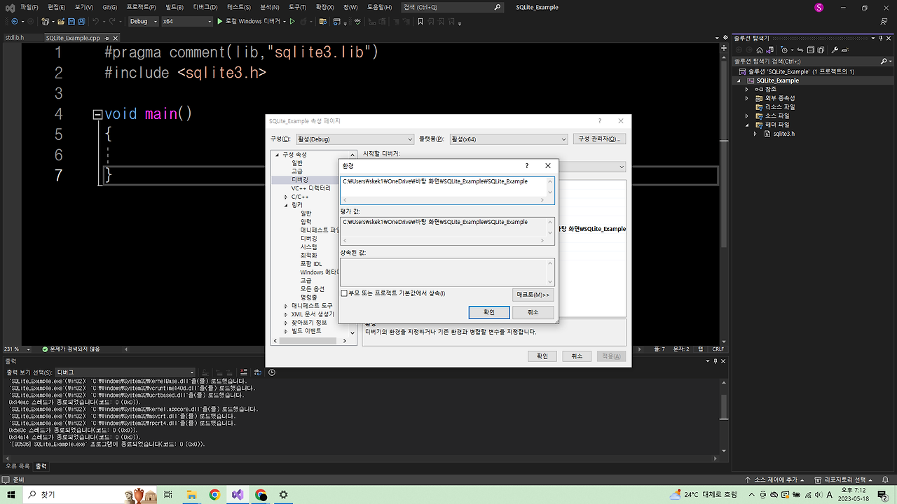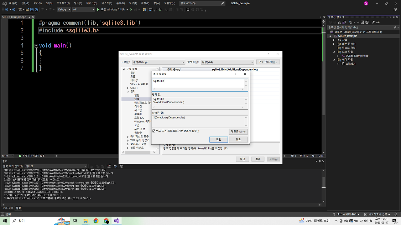 sqlite3.h, sqlite3.lib, sqlite3.dll 추가를 예제로 한다.