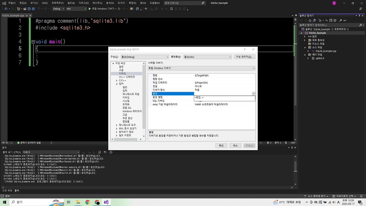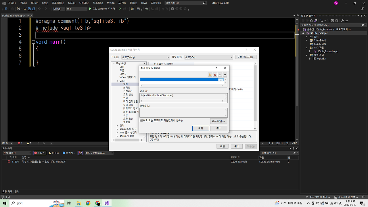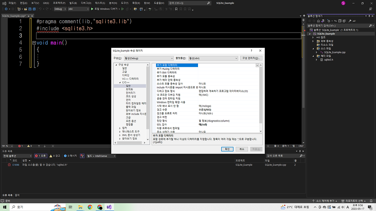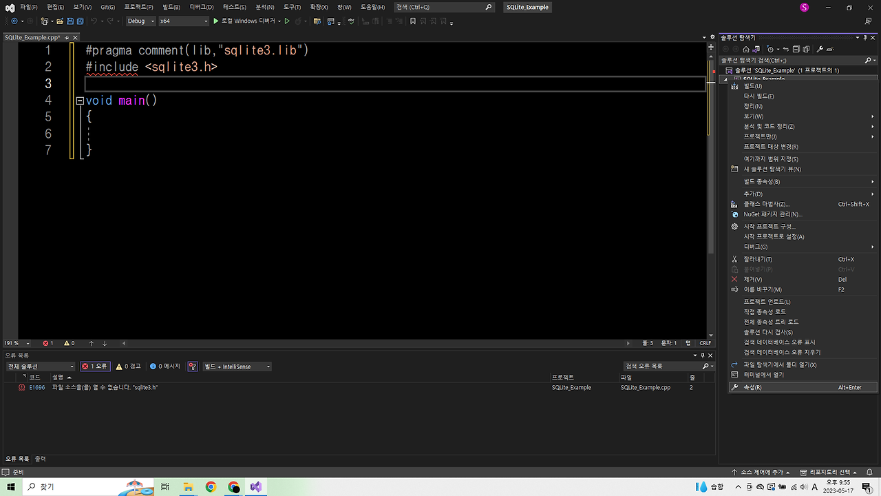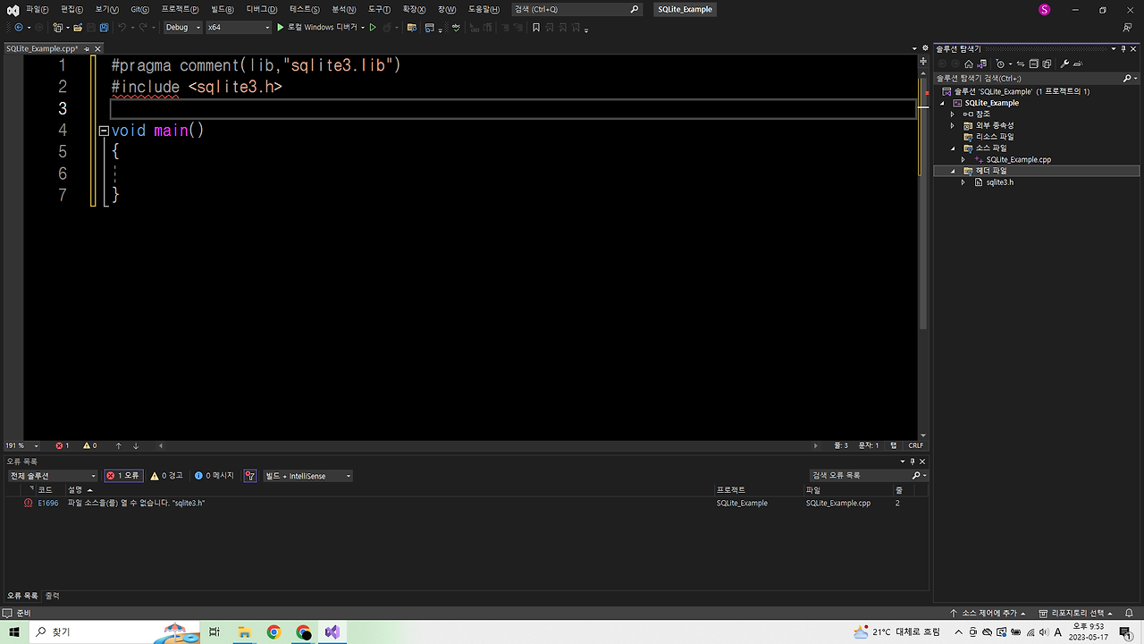 sqlite3.h, sqlite3.lib, sqlite3.dll 추가를 예제로 한다.