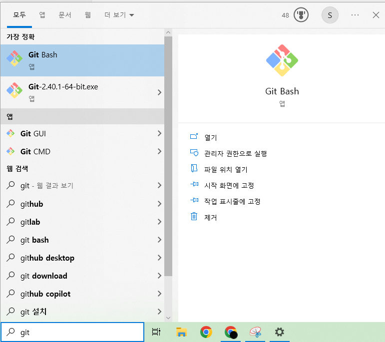1. 시작 버튼 눌러 Git Bash를 입력 후 실행