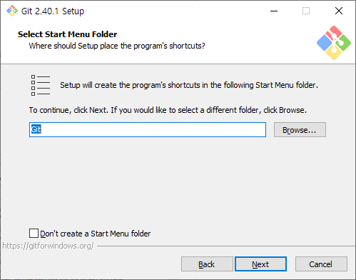 Don't create a Start Menu folder 체크 시 윈도우 키 누르면 나오는 시작 메뉴에 git이 안 뜸.