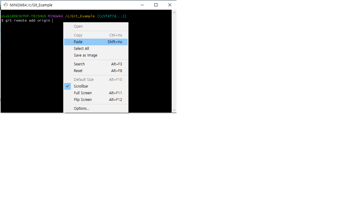 git remote add origin 적어준 후 띄어쓰기 한번 하고 -> 우클릭 -> Paste