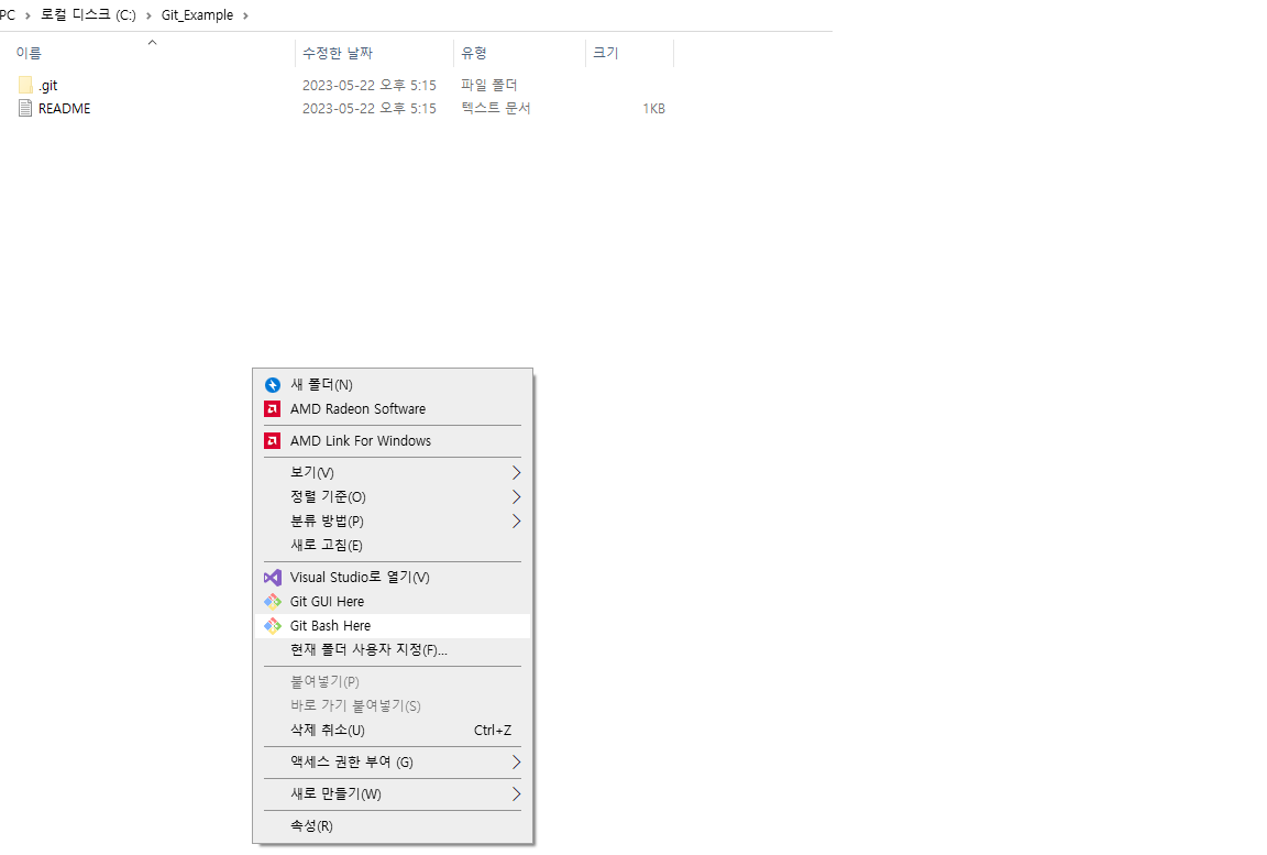 2. 로컬 저장소 폴더로 와서 Git Bash Here을 클릭한다.