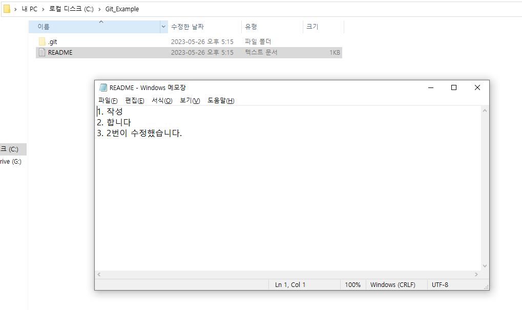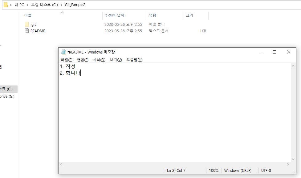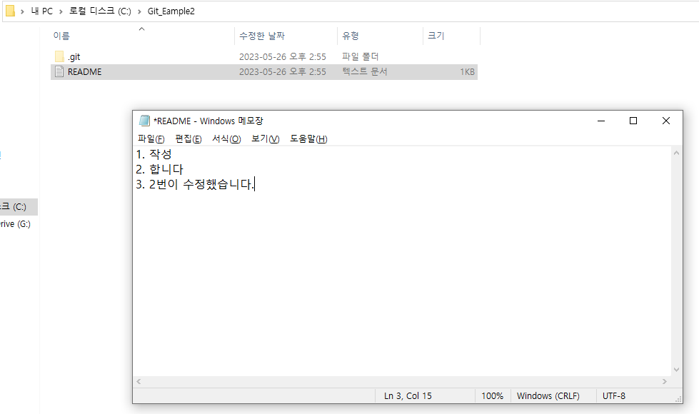 2. 로컬 저장소2(Git_Eample2)에서 README.txt 파일을 수정 할거다.