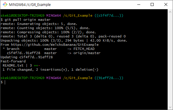 로컬 저장소가 원격 저장소의 최신 버전으로 업데이트 된다.