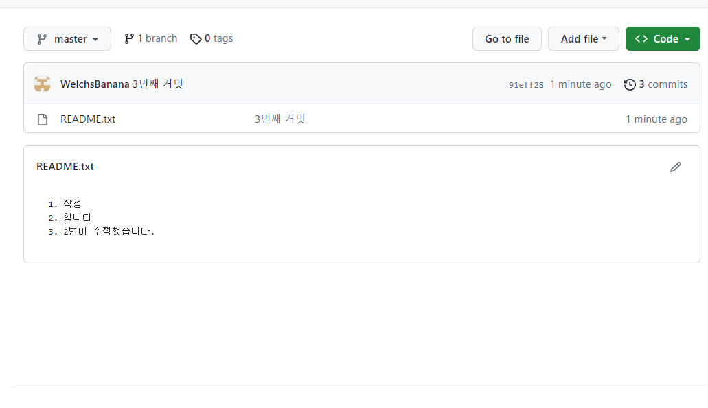 4. 로컬 저장소1의 README.txt 를 열어보면 최신 버전으로 업데이트 된 걸 확인 할 수 있다.