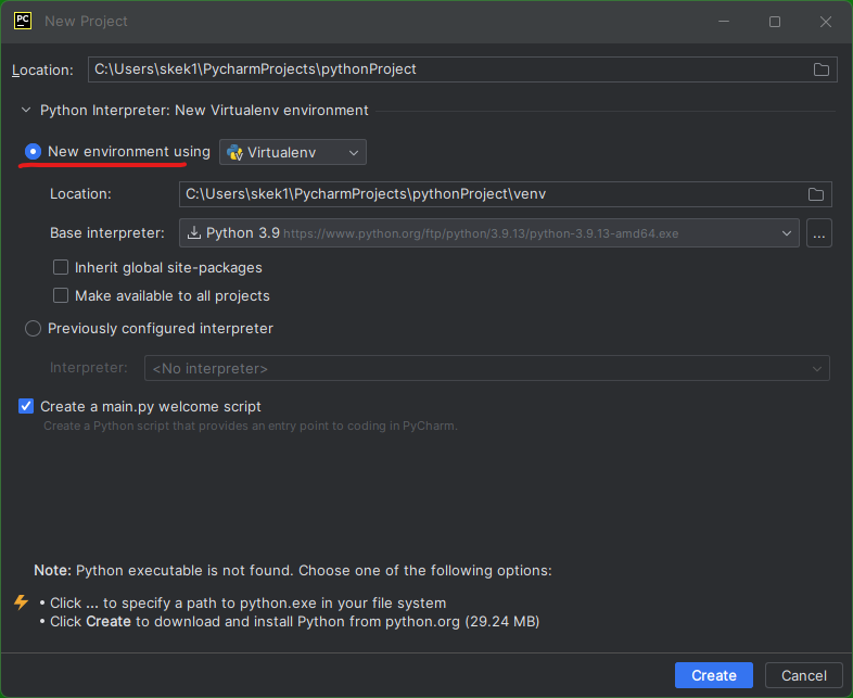 - 당신이 파이썬이 처음이라면 New enviromnet using을 선택 후 Creat 클릭.