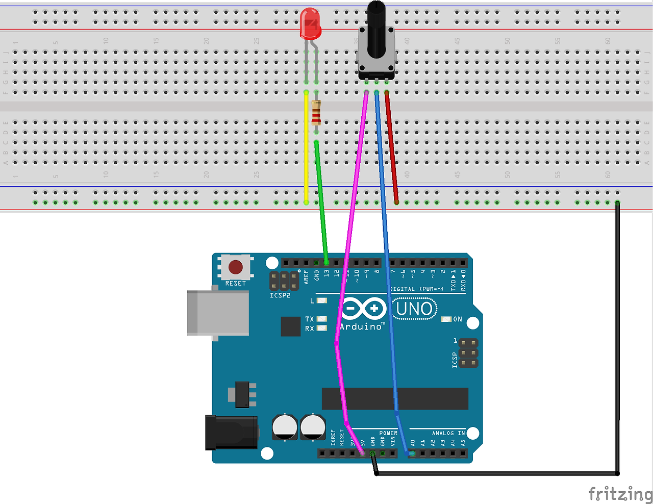가변 저항은 스위퍼를 돌려서 0 ~ 1023 값을 받을 수 있다. 가변 저항에서 얻은 값으로 LED 밝기를 조절 해 보자. 회로도 저항은 220옴을 사용하면 된다. 코드 구현 가변 저항 값이 커질 수록 LED 밝기가 올라간다. map함수 = 가변저항 최대값(1023) / LED 최대값(255)의 근사치다. 쉽게 말하면 가변저항 값을 LED 값으로 변환한다. #define LED_PIN 11 void setup( ) { pinMode(LED_PIN, OUTPUT); } void loop( ) { int readVal= analogRead(A0); readVal = map(readVal, 0, 1023, 0, 255); //가변저항 값 -> led 값으로 변환 analogWrite(LED_PIN, readV..